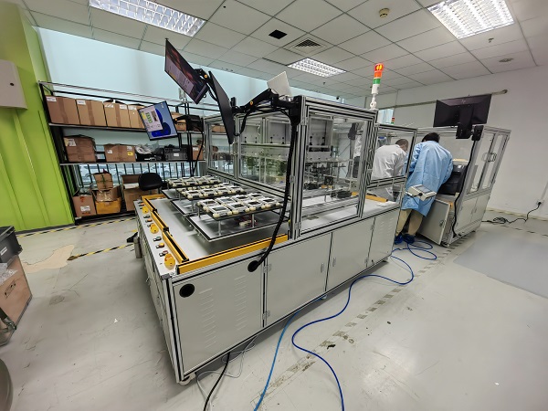 6.1)上料位,蓝领把装配好的QMX6产品,摆放到托盘穴位中。按开始按钮,托盘自动移动到标定箱位,箱盖下落,标定箱密封,KNX上电,风扇开启5-10秒。